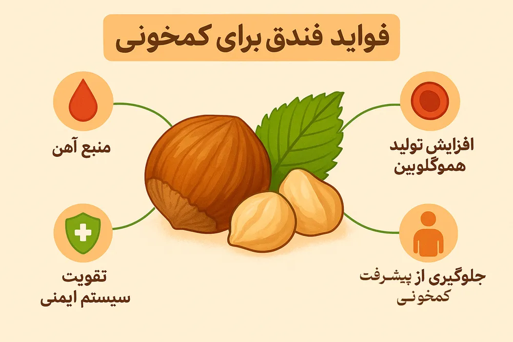 خواص فندق برای کم خونی توسط بسیاری از پزشکان تایید شده است. بیشتر بیمارانی که دچار کم خونی شدید هستند می توانند از فندق به صورت روزانه استفاده کنند. استفاده از فندق به صورت روزانه برای درمان بیماری کم خونی موجب شده که بیشتر بیماران نتیجه بگیرند. شما برای رفع کمبود آهن در بدن خود می توانید مقدار مناسبی از فندق را در رژیم غذایی خود قرار دهید.