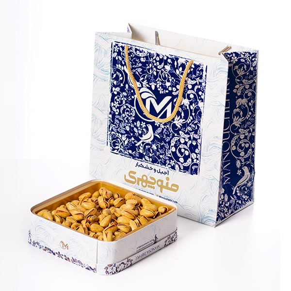 - به همراه بسته بندی به صورت باکس درب دار با جنس مقوای فشرده با کیفیت به همراه یک بگ زیبای طرح دار آجیل منوچهری