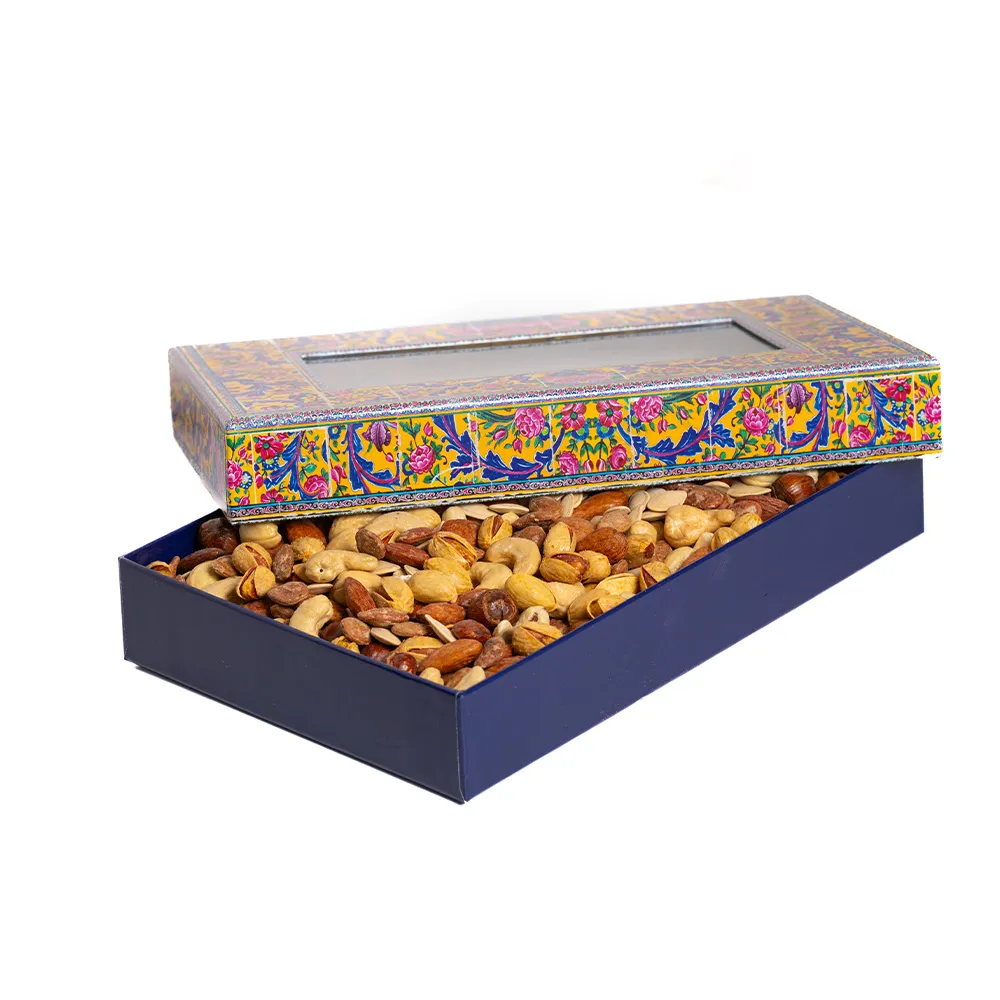جنس این پک آجیل هدیه از مقوای بسیار مقاوم بوده و آجیل خالص موجود در این پک آجیلی 800 گرم آجیل ممتاز است.