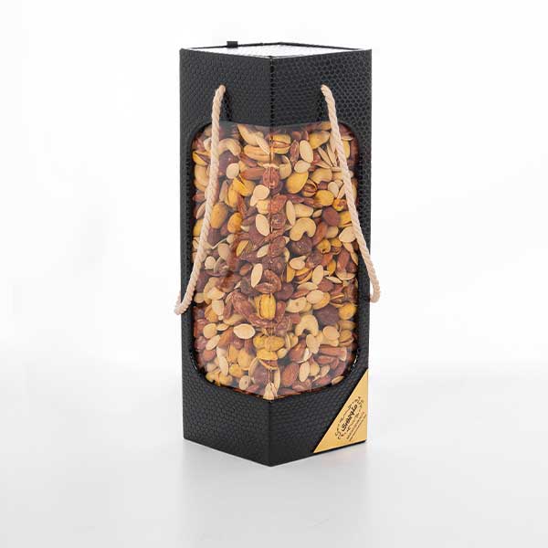 در این باکس مجموعا 1/200 کیلوگرم آجیل رویال قرار دارد. آجیل مخلوط به کار رفته در این باکس شامل پسته با پوست ، مغز بادام درختی ، بادام هندی،  فندق با پوست و تخمه کدو و تخمه جابانی می باشد .
